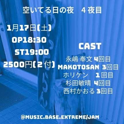 空いてる日の夜 4夜目 SCHEDULE 2026/01/17(土) 18:30 - MUSIC.BASE.EXTREME/JAM 地図を表示 ご予約はオフィシャルLINEへ名前(ニックネーム可) 枚数を記入して送信して下さい オフィシャルLINE→https://lin.ee/LHLyM3t URLをコピーする 報告する